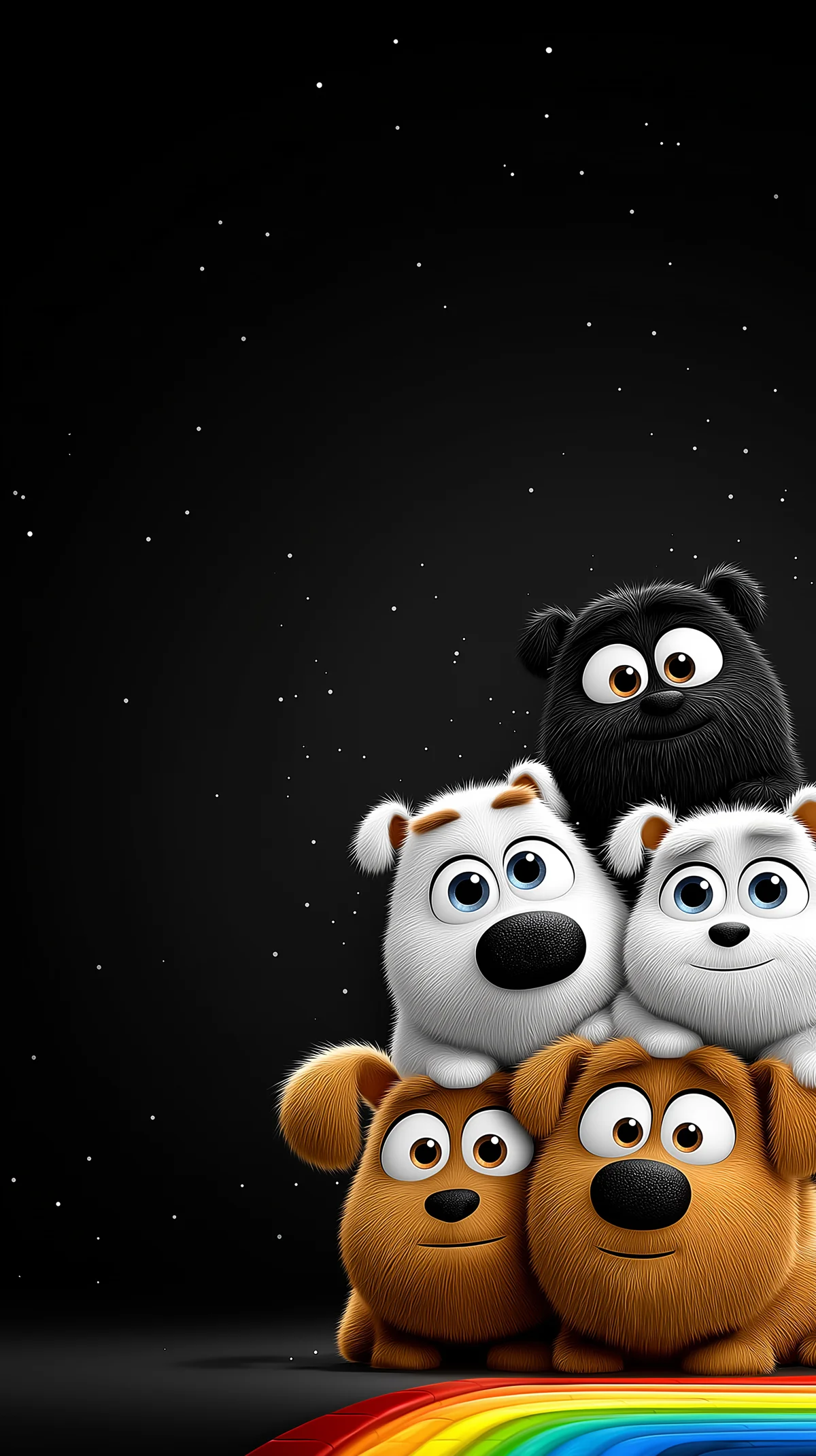 The background stays deep and simple, and the tiny stars scattered throughout it add just the right amount of texture to keep it from feeling empty. There is even a faint glow behind the top puppy that makes it look like a soft spotlight, which naturally draws your eyes to the group. What about the rest of the space? Clean, open, and ideal for icons or widgets.
